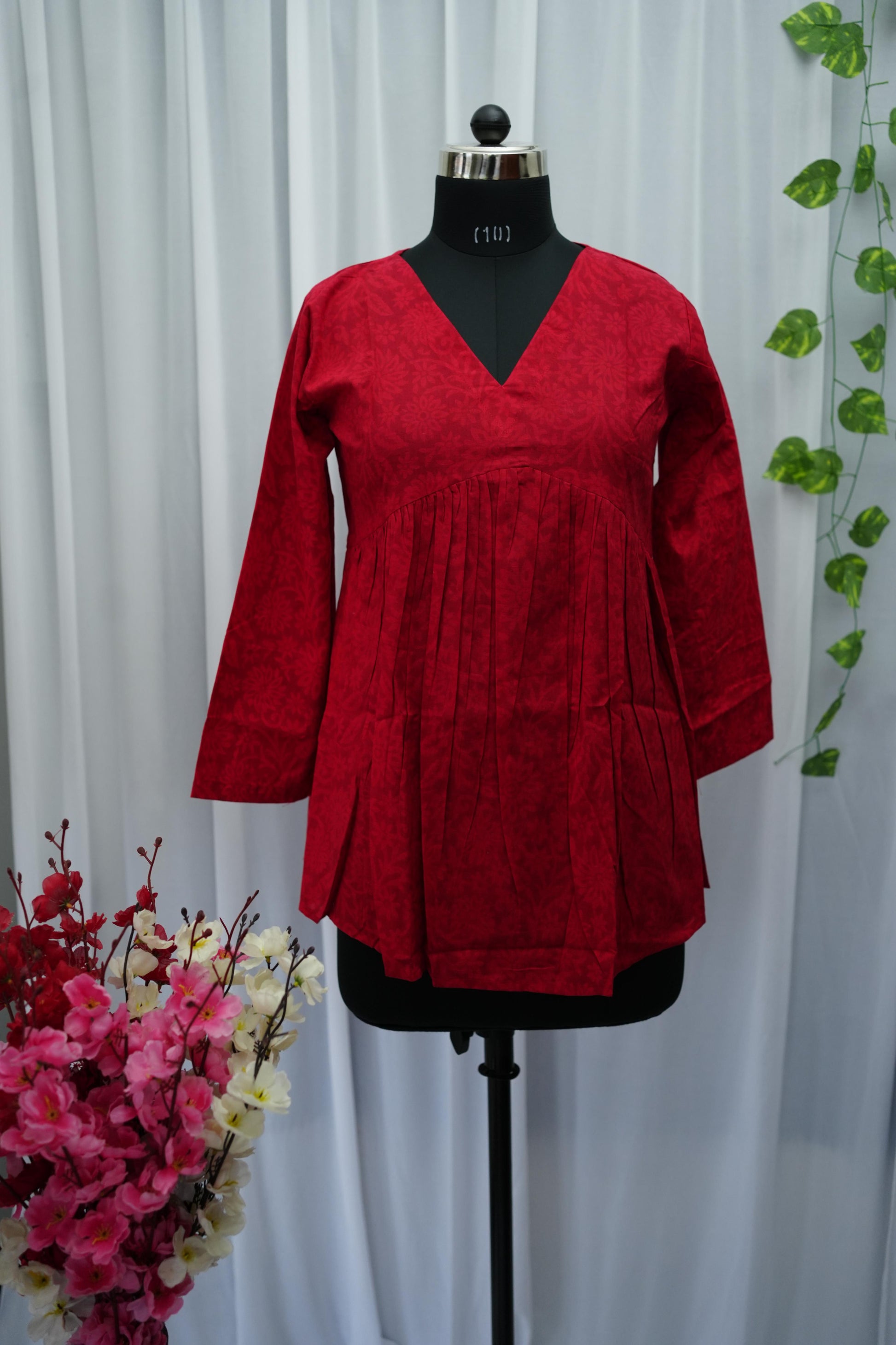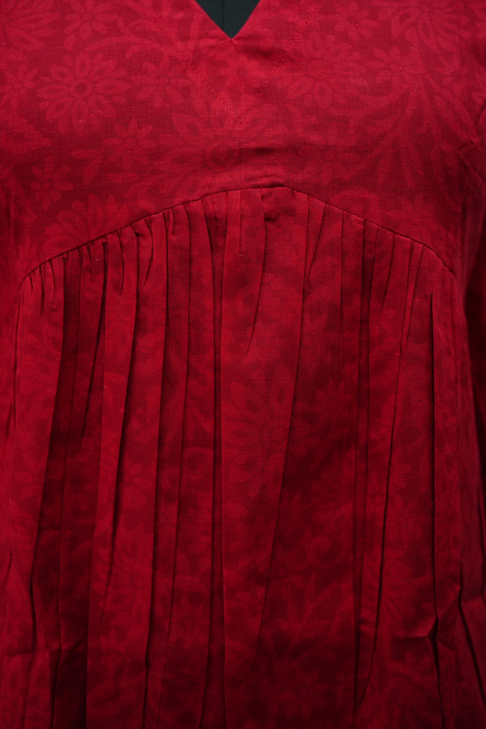 Elevate your everyday style with this maroon floral block print kurta. Crafted from soft cotton fabric, it features a timeless hand-block design in shades of blue and white. The V-neckline and three-quarter sleeves add a flattering touch, making it perfect for both casual and semi-formal occasions. Pair it with jeans, palazzos, or your favorite leggings for an effortlessly chic look.